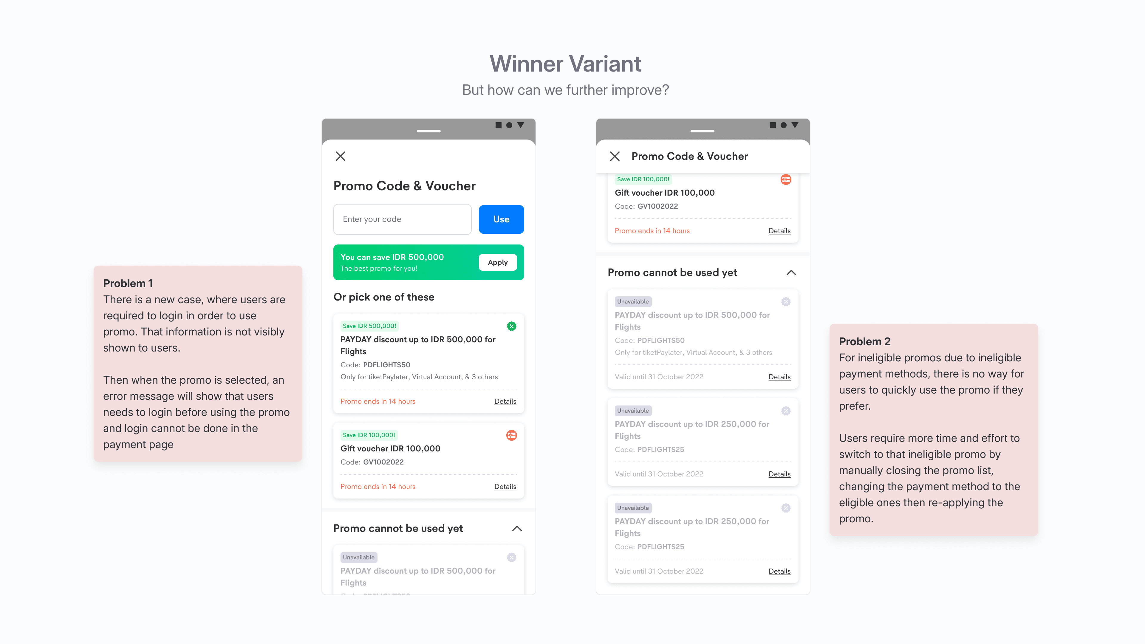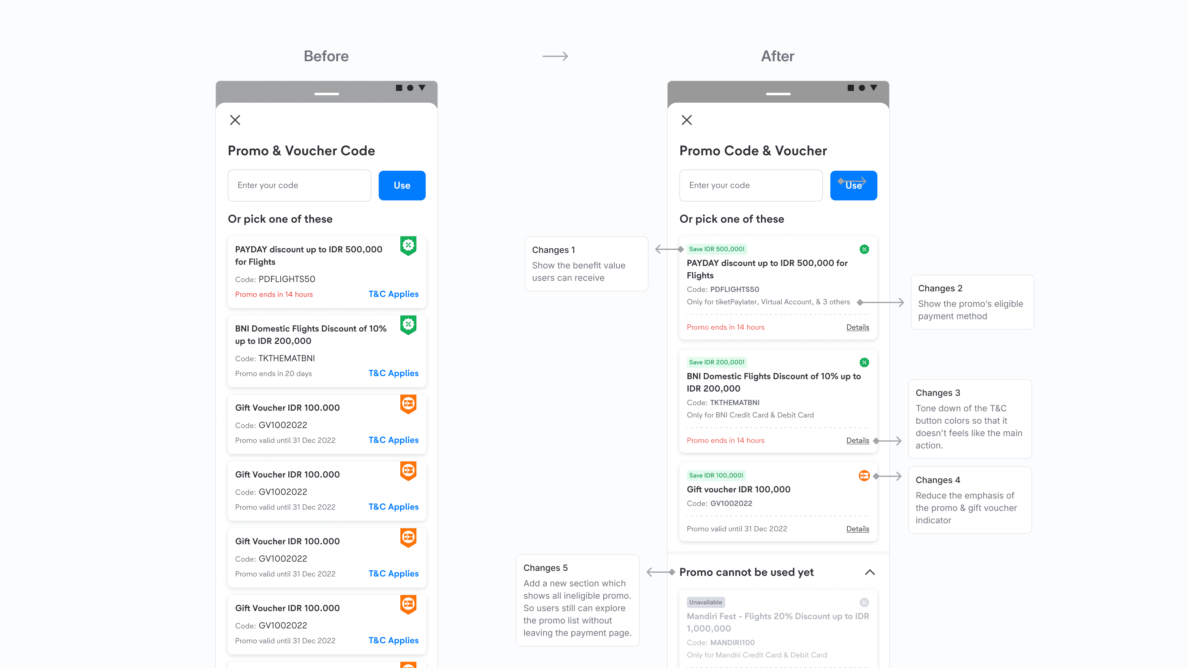 In response to these problems, we initiated ideation sessions with stakeholders to produce optimal solutions. We plan to implement A/B testing to mitigate risk before fully implementing the revamped promo list, assessing its usability and impact on targeted user groups. The main objective was to enable users to apply the most suitable promo for their order, maximizing benefits without compromising essential information. This initiative aimed to enhance payment conversion rates swiftly and effectively.