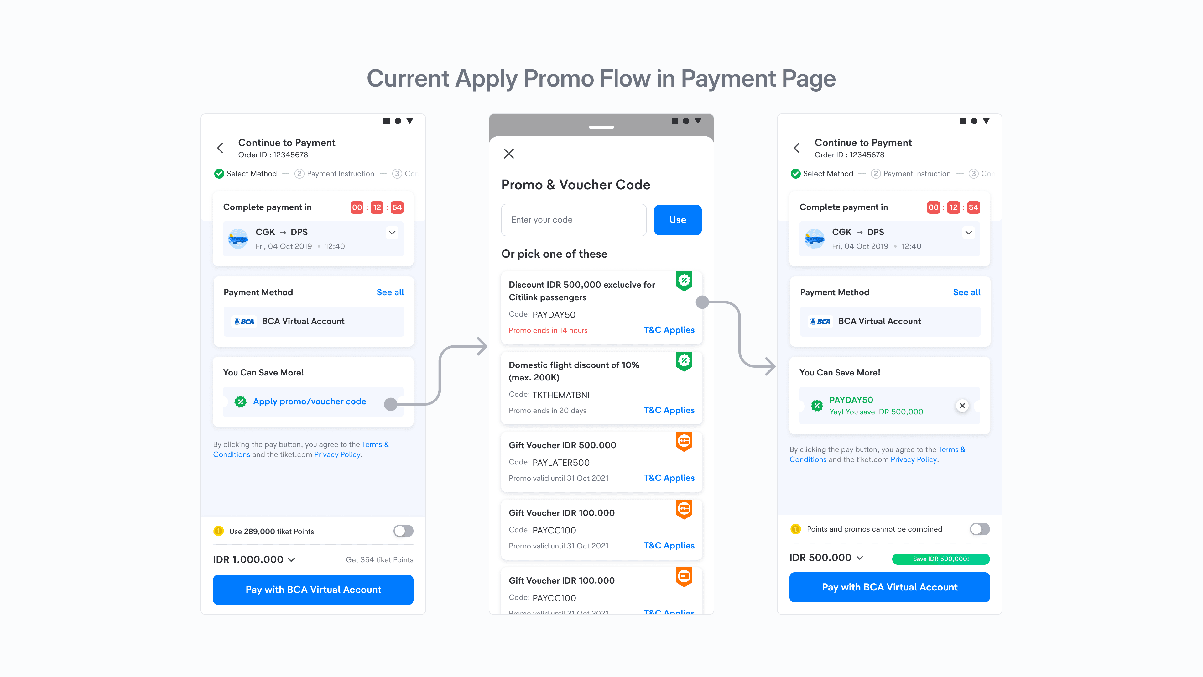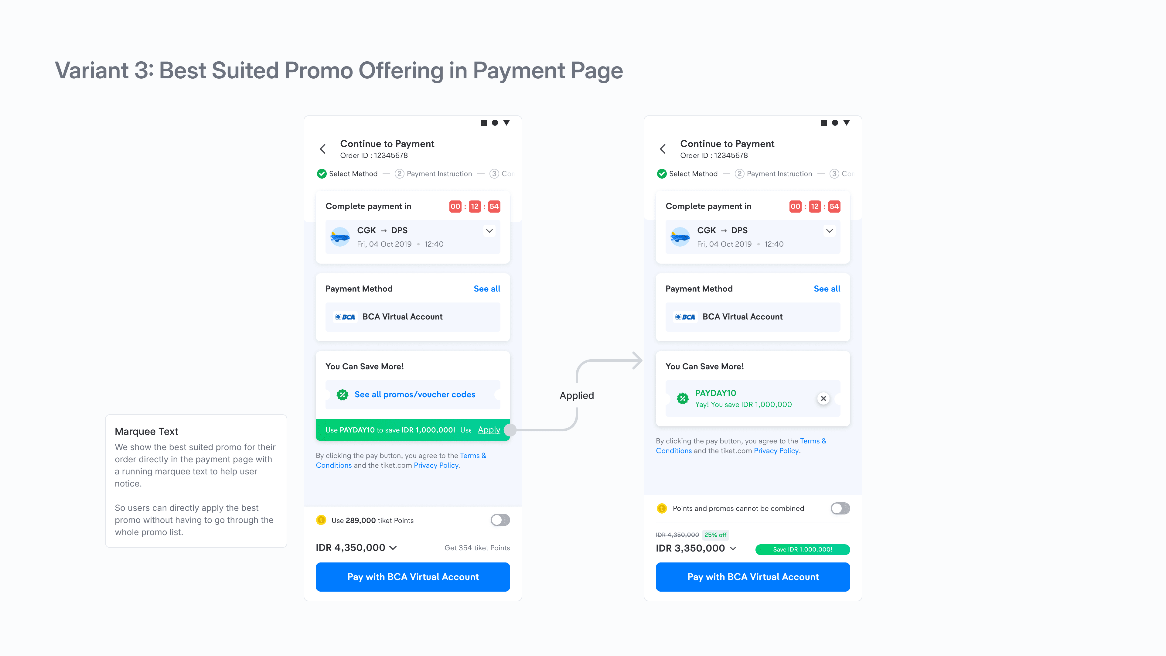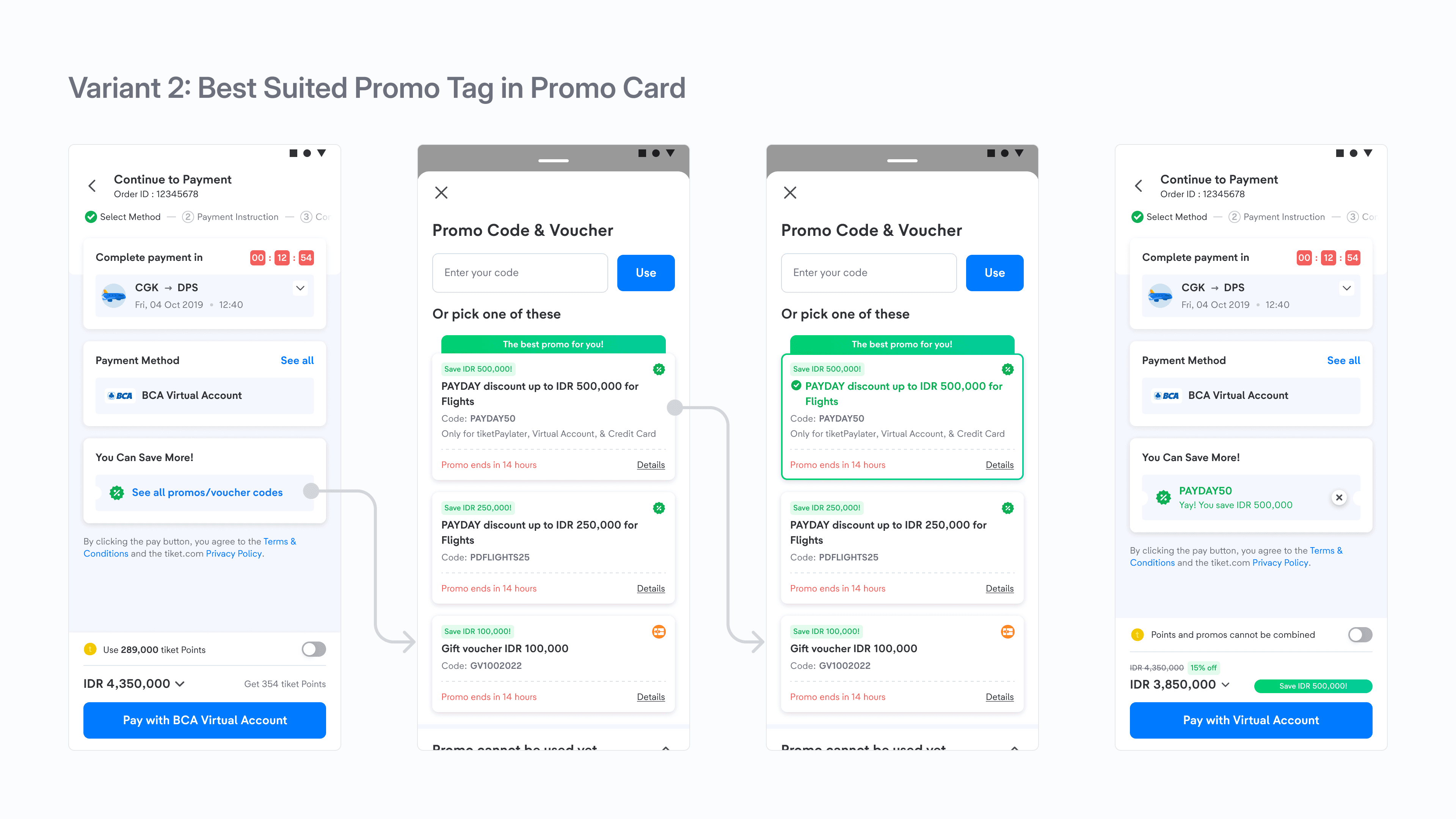 Since our main intention is eliminating user's need to navigate through the entire promo list to apply the best promo. We conceptualized three different variants, each designed to enable users to apply the best promo with just a single click, reducing complexity and enhancing convenience.