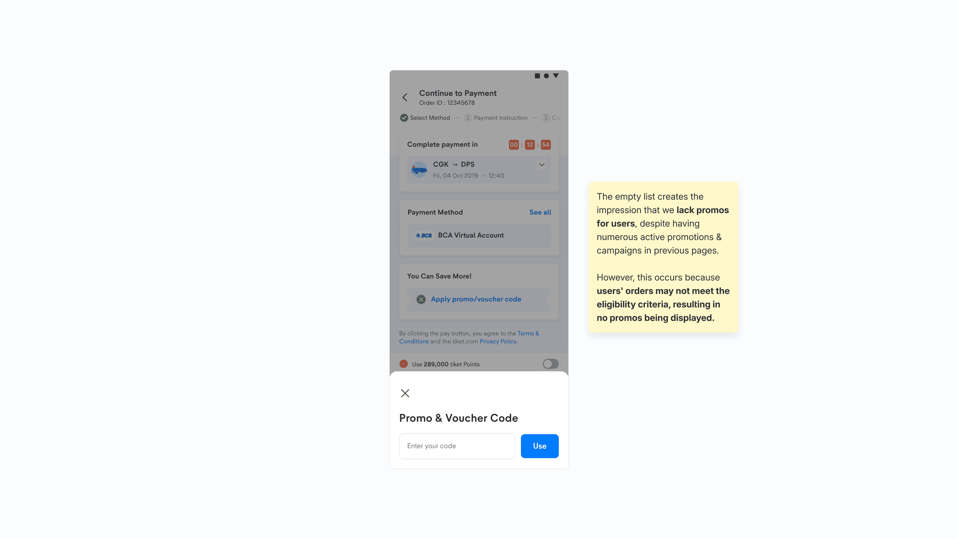 Based on our user interview, users are generally happy transacting in tiket.com, there’s no major problem with our information architecture and design in general. However, accessing all promos and ensuring the best prices at checkout remains the key problems to users. The overall insight highlights the need to improve our promo list, a critical aspect of the payment journey. To address this, we'll enhance navigation and refine our promo list to empower users in making informed decisions.