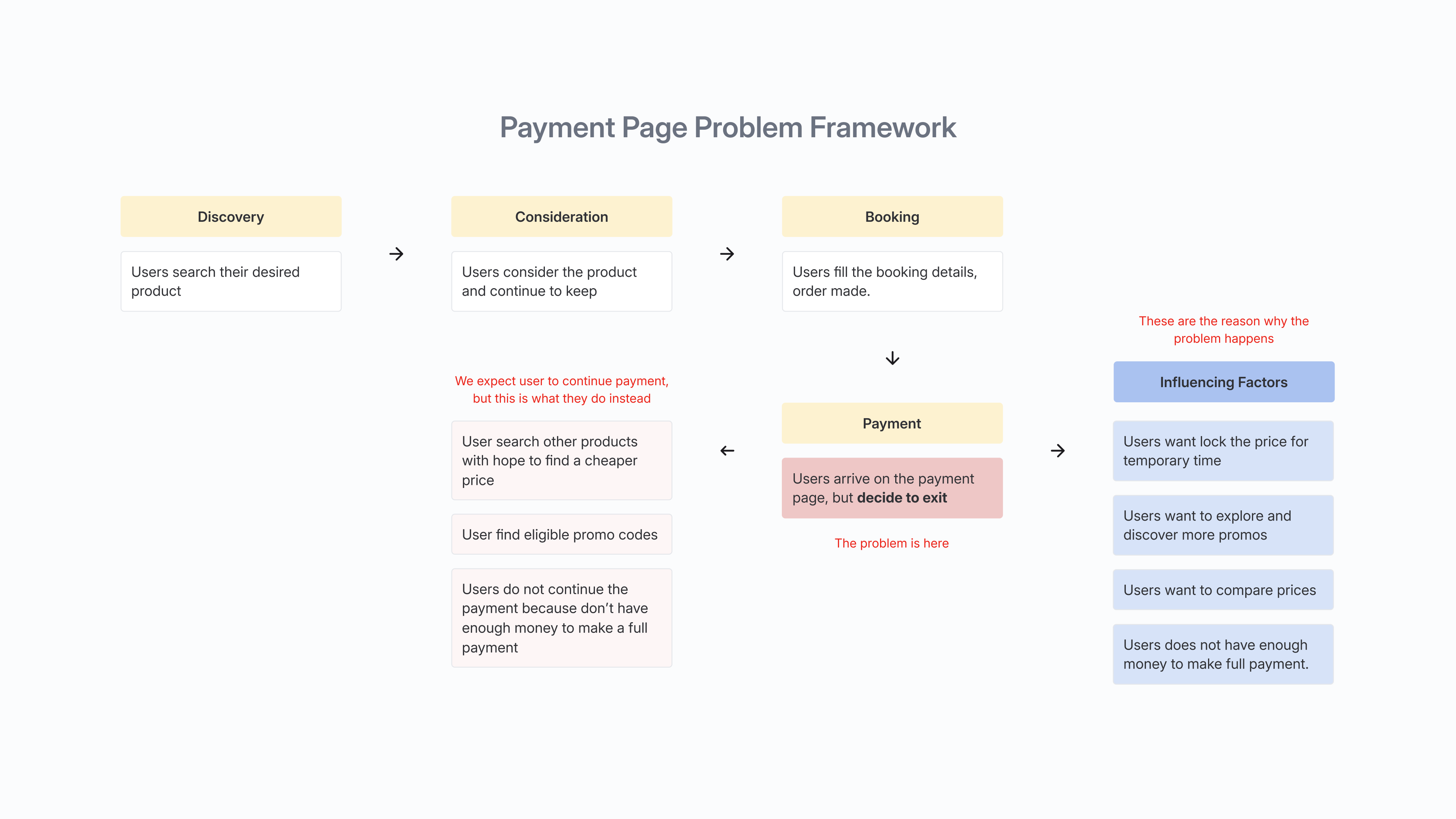 Based on the user interview, user exits the page without continuing the payment because mostly users want to lock the product first, compare prices, and check promos. We further validate by conducting survey and getting the statistical information with bigger audience to help us with the design directions.